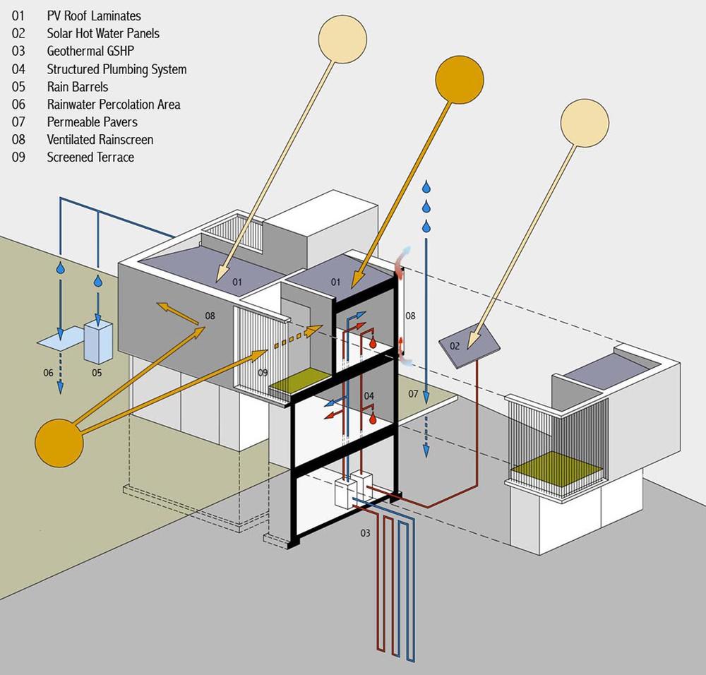 The owner pursued this project as a case study for green housing in an urban setting, and he is intent on sharing his experiences with the public, through open house events and publications. The building performance is going to be monitored over the next few years, with a particular focus on the effectiveness and economic feasibility of the photovoltaic and geothermal systems; the data will be used by the various consultants to fine-tune future designs and will provide valuable information for other projects.