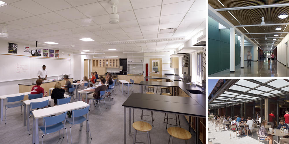 The project reinforces the character of the existing campus, placing science and student life facilities at the heart of the school community and creating a new quadrangle that provides inviting outdoor spaces and stronger links to other school buildings. Through proportion, texture and color, the new building offers a contemporary dialogue with the historic Main Building nearby.