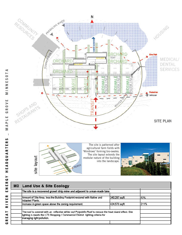 The site's location within a half-mile of basic services and several medium-density residential neighborhoods reduces transportation impacts. Maple Grove Transit Center is across the street, offering access to multiple bus routes serving the greater Twin Cities area. Additionally, Great River Energy worked with public transportation services to provide a shuttle bus between the Maple Grove headquarters and their Elk River Park & Ride for employees who live outside the metropolitan area. The buses operate twice in the morning with two return trips in the afternoon.
