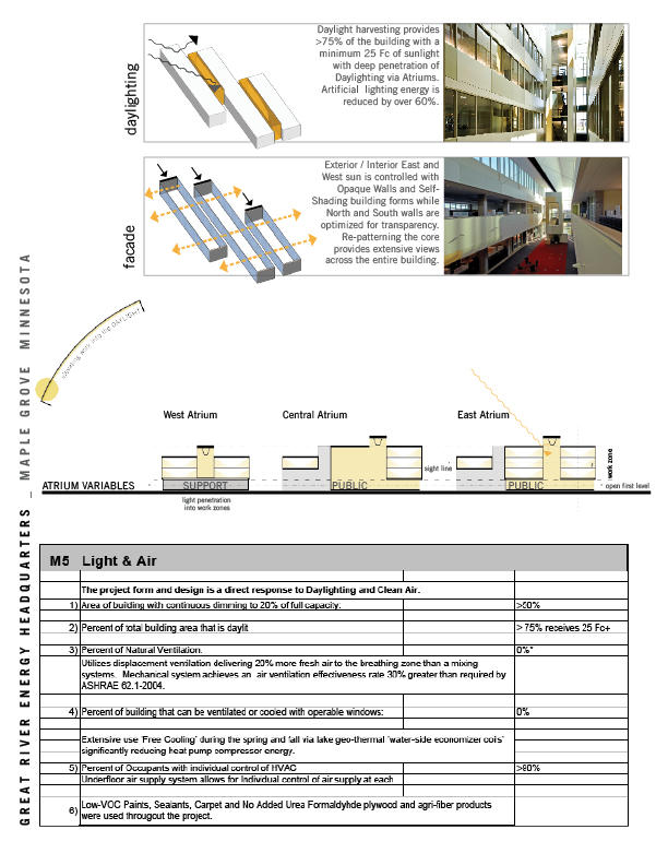 A variety of building design strategies emerged, including: creating quality space rather than quantity of space; optimizing collaborative work areas; daylighting all work zones using narrow atria; reducing the CO2 footprint of the concrete; and demonstrating leading-edge applications of simple technologies. A few of these examples include using a remanufactured, commercial-scale, urban wind turbine and combining a water-source heat pump with low-velocity under-floor thermal displacement ventilation.