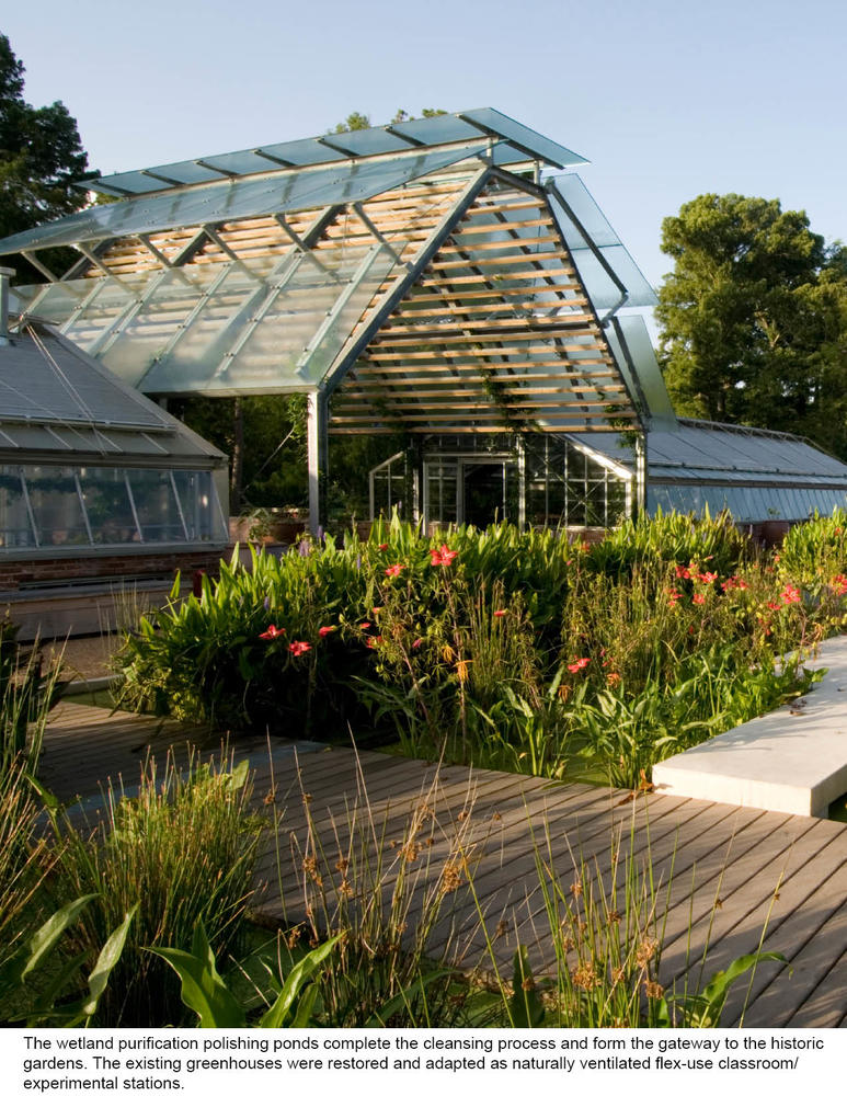 The architecture responds to both the manmade and natural environments of Shangri La. The visitor center, which surrounds a wetlands demonstration garden, is the gateway to the historic ornamental gardens. It takes its cues from the brick, glass, and steel greenhouses built in the early 1920s, which form one edge of the complex. Circulation is outdoors, often under wide canopies that protect from sun and rain. The structures in the natural areas—the nature discovery lab and pavilion, outdoor classrooms, bird blind, and boat house—were designed for minimal impact, floating above the land on helical pier foundations and powered by photovoltaic panels.