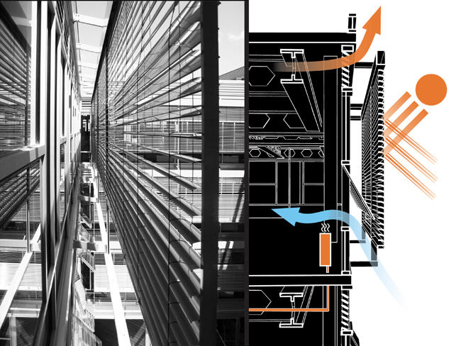 Each facade of the building was designed to respond uniquely to wind direction, solar angle, and views. The east and west elevations feature reduced glazing with punched windows protected by fixed glass and steel sunshades to reduce solar heat gain. Exterior venetian blinds controlled by a sensor on the roof measure the light level and sun angle to open, close and adjust as necessary, reducing glare and direct solar radiation on the south- and west-facing courtyard facades.