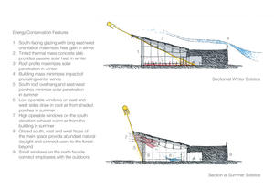 The building orientation and massing of the education and visitor center maximize the site's passive solar and natural ventilation potential with simple but effective strategies. The long south face maximizes solar gain in winter months and the floor slab of the main space serves as a heat sink to store solar energy. The north side of the building, conversely, shields the building from winter winds. The tilted main roof aids both of these functions, maximizing solar radiation and light to the south, while deflecting north winds. The roof covering is light colored to minimize the heat island effect on the surrounding environment. Natural ventilation is optimized by bringing cool air in from the shaded porches to the east and west and exhausting warmer air through windows high on the south face. These porches and south roof overhang also shield the building from direct summer sun. The sloped main roof moves warm air in the space to the high exhaust windows, and the venturi effect aids in ventilation as wind moves over its top. To increase natural ventilation during extreme conditions, the south face of the main space contains large sliding doors that can be opened to maximize ventilation.