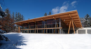 The design process also involved research on materials to assure that the team selected not only the most appropriate materials but also the most cost-effective and efficient use of those materials. One study, for instance, developed several alternative roof structures for the project. The team evaluated long-span systems to determine the most cost-effective solution for providing a column-free main gathering space. The best solution, a stressed-skin-panel roof diaphragm supported on glued-laminated timbers, maximized the efficiency of each product.