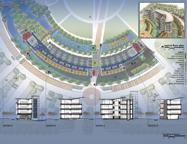 The site provided excellent opportunities to take advantage of climatic conditions. From a solar standpoint, a building that stretches from east to west was easily attained; however, further study of the building's position within the concentric ringed master plan offered the opportunity to arc and articulate a layered footprint, allowing more light into the building later in the day. Light modeling confirmed the best arrangement of vertical fins to redirect light, even in late afternoon. The southern facade of the arc is longer, tracking the sun. The northern facade cups the commons, offering a shaded wetland area.