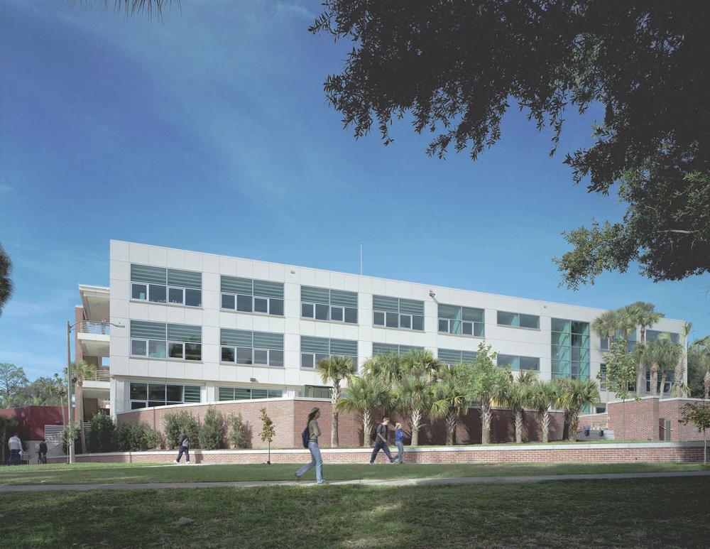 Although the University of Florida has a long-standing master plan process, this site was selected using unique criteria during a walking tour by Dr. Charles Kibert (dean of the School of Building Construction) and the vice provost. They selected this site, an existing parking lot adjacent to two residential halls, in order to preserve green space, build on already-disturbed land, and reduce the need for on-grade parking. This basic sustainability insight was felt to be missing in the University’s traditional site selection process.
