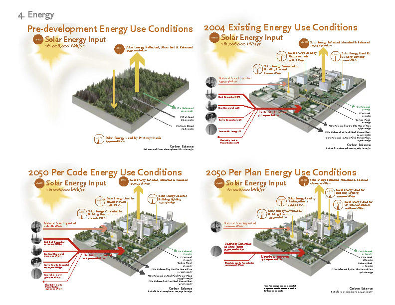 Energy demand will be reduced and onsite renewable energy resources, such as daylighting, wind power, photovoltaic systems, and biogas generation, will be harnessed. A shared "thermal loop" will balance heating demands among complementary uses. Solar utilization will increase from 2% currently to 13.7% in 2050, exceeding the pre-development utilization of 5%. The carbon balance will be reduced from 29,000 tons per year to 2,000 tons per year, despite the addition of 8 million ft2 of new buildings. Almost 90% of the power will come from renewable sources in 2050, and carbon neutrality will be achieved through the purchase of carbon credits.