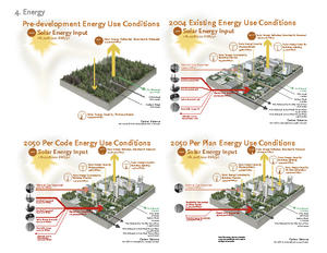 The energy vision of the Sustainable Design Plan is to create a neighborhood in which the carbon balance and the use of incident solar energy equal or improve upon the predevelopment condition. The plan will increase the solar utilization from 2% today to 13.7% in 2050.