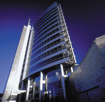 The building is constructed on the original basement and foundations of a demolished warehouse; a cast-in-place concrete frame is clad with an aluminum and glass curtain wall. Portions of the podium are clad in stone. Interiors are finished with aluminum and indigenous wood ceilings. Raised floors are used throughout. Wall finishes include glass, stone, and plastered gypsum wall panels.