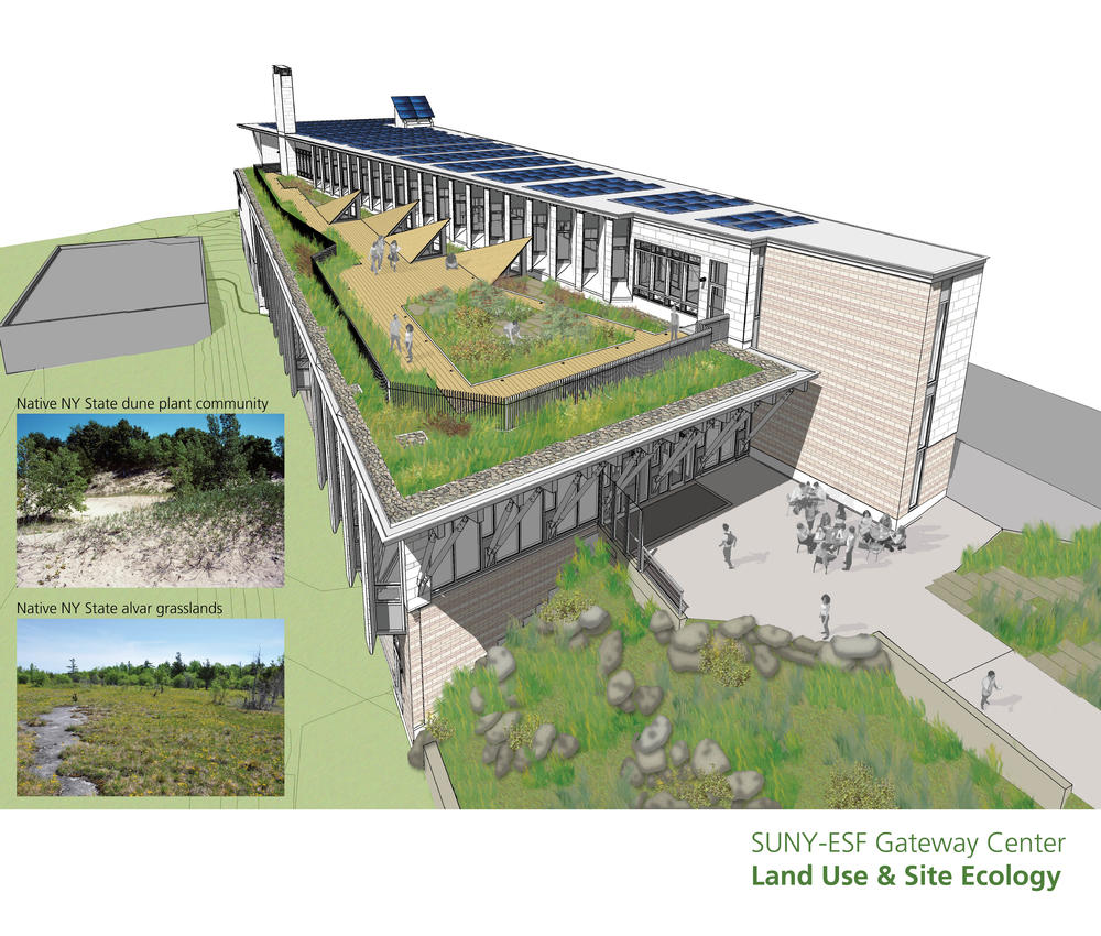 The SUNY-ESF campus sits on the edge of a glacial formation that typifies the Finger Lake Region of Upper New York State. Native ecosystems are threatened by acid rain and rising temperatures. The green roof is designed to study Alvar Grasslands and Great Lakes Dune plant communities. The SUNY-ESF’s Landscape Architecture Department propagated many species that were unavailable commercially and installed ledgestone common throughout Alvar ecosystems. Measurement devices enable faculty and students to track plant colonization, insect density, soil moisture, temperature, and humidity.