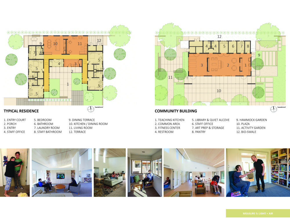 The buildings orient to the prevailing winds, allowing 100% of the primary residential and program spaces to be naturally ventilated. A system of low velocity ventilation air is also provided to ensure healthy indoor air quality at all times - even when windows are closed. Ceiling fans are not appropriate for this project due to potential sensory stimulation experienced by residents. A variety of materials ensure healthy indoor air quality, including no -VOC paints, adhesives and sealers, formaldehyde-free insulation and wood products, and non-toxic, vinyl-free flooring. A “green housekeeping” plan requires environmentally friendly cleaning solutions to reduce chemical sensitivity.