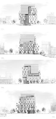 Setbacks in the building massing created by the volumetric composition create planted roof terraces at varying levels on all four sides of the building to take advantage of the building’s height relative to the surrounding neighborhood and provide views out over the city of Baltimore.