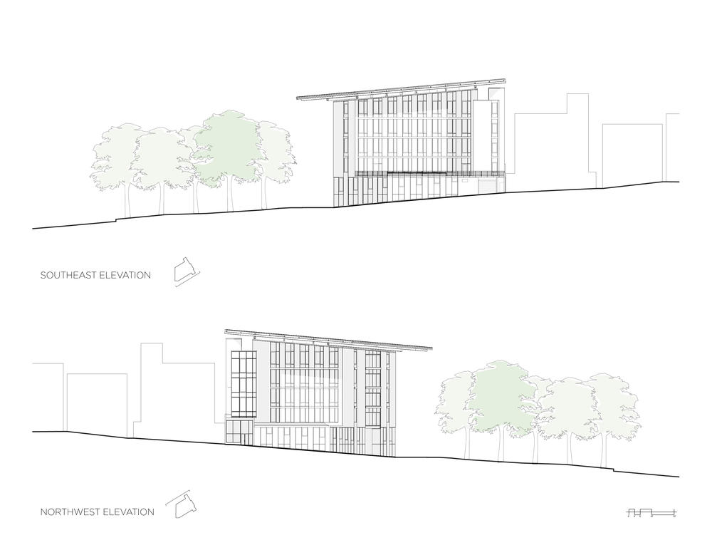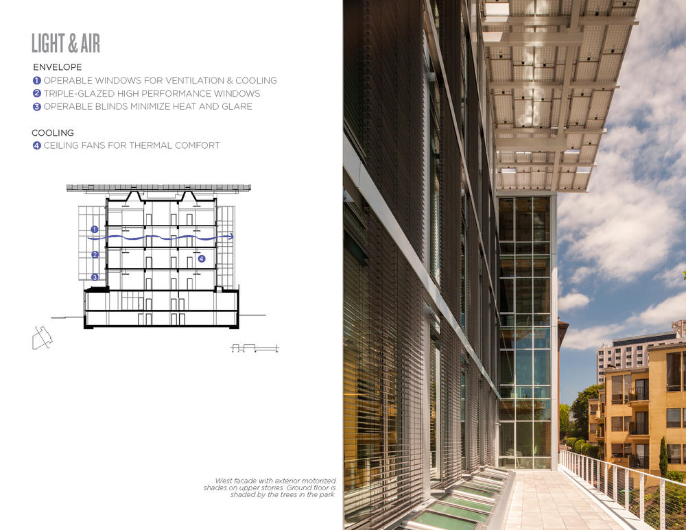 Daylighting design and access to windows for ventilation drove building massing and orientation, as allowed by the sloped five-sided urban site. Primary daylit facades are optimally oriented for the climate and building width was limited to facilitate daylight penetration. The west façade is shaded by mature trees in the adjacent park when most needed to offset solar heat gain and glare.