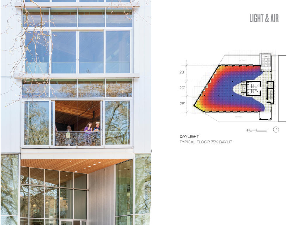 Given Seattle’s temperate climate, the prime climatic response was to design a building to operate with no heating and cooling energy much of the year.