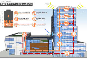 The building's enhanced mechanical systems also play a big role in energy savings. This system focuses on high indoor air quality and energy efficiency with an air recovery system in the atrium that captures heat and reuses it elsewhere in the building.