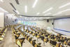 In addition to providing daylight and connecting the outdoors to the large lecture rooms, the atrium also serves as a collector of hot air as it rises in the space. By locating the mechanical floor level to the top of the atrium, heat recovery is easy and efficient. The atrium is also home to an amazing art piece, made of a series of LEDs of varying color temperature arranged in a sunburst pattern. Since daylight is so important to circadian health, it is very appropriate that this piece was selected for the main atrium space.