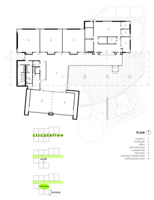 Design elements provide a flexible-use infrastructure: a wood-clad cable tray, located in the circulation spine and doubling as an entry soffit at classrooms, makes maintenance possible without disrupting classes and allows for easily changing out technology; large sliding glass walls between the multi-purpose room and the commons, and between the commons and the outdoor plaza, allow the building to be opened up to create a dynamic flow of spaces for larger events; and frosted glass partitions throughout the building share light between spaces and function as additional "white board" space for classrooms.