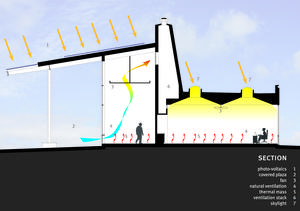 The remaining energy needs are met through a 109kW roof-top photovoltaic array, including translucent panels covering the outdoor entry plaza.