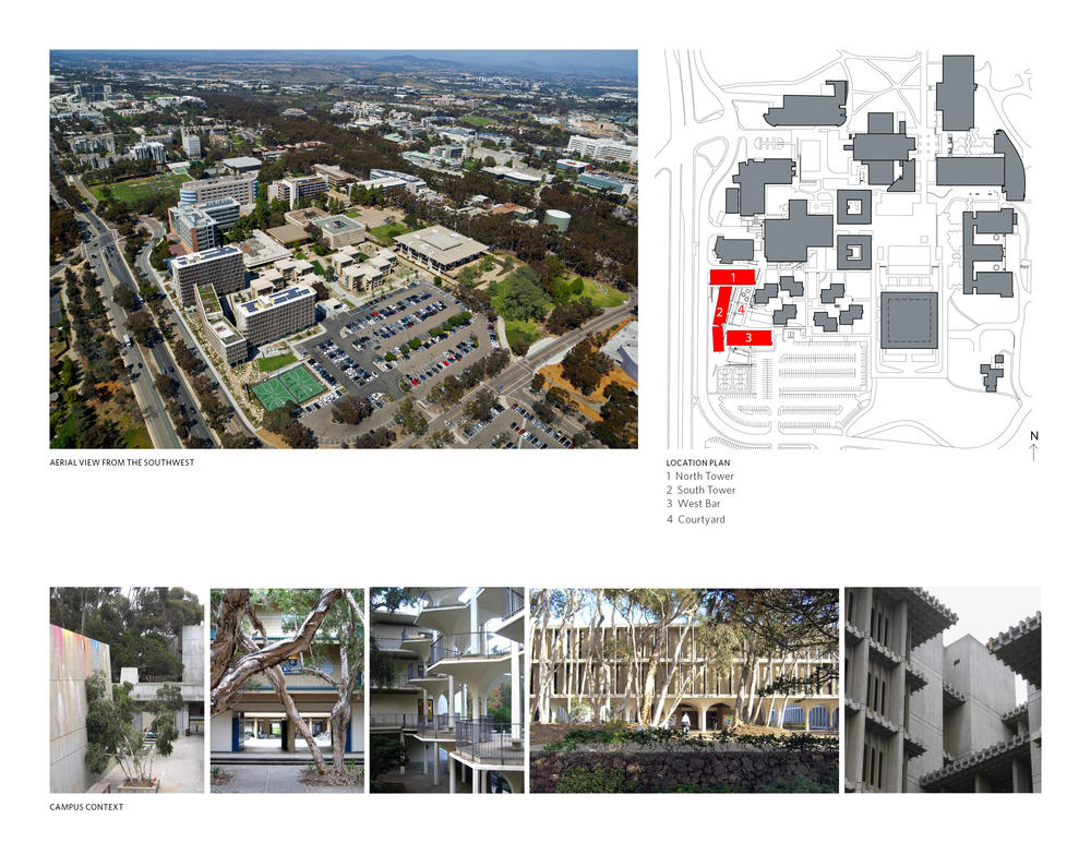 Three apartment buildings are arranged in a C-shape around a courtyard that creates a new social zone and unites it with the existing 1960s Fleet Residences to the east. They adopt elements from the classic campus buildings; exterior walkways, repetitive sun control elements, and a warm color palette, but are firmly rooted in a 21st century aesthetic that unites form and performance. Great lengths were taken to construct the buildings with high quality, cast-in-place white concrete to visually tie them to the existing architecture.