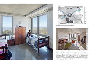 The location offers remarkable views to residents as well as access to refreshing onshore breezes. The apartments are situated to provide expansive views of the ocean and mountains from all interior spaces, and from exterior walkways and the large roof terrace, which have become popular gathering spaces. The buildings and landscape promote the active use of exterior spaces, encouraging interaction among students with outdoor circulation that leads to chance encounters, convenient spaces for individual and group activity, and spaces conducive to congregating.