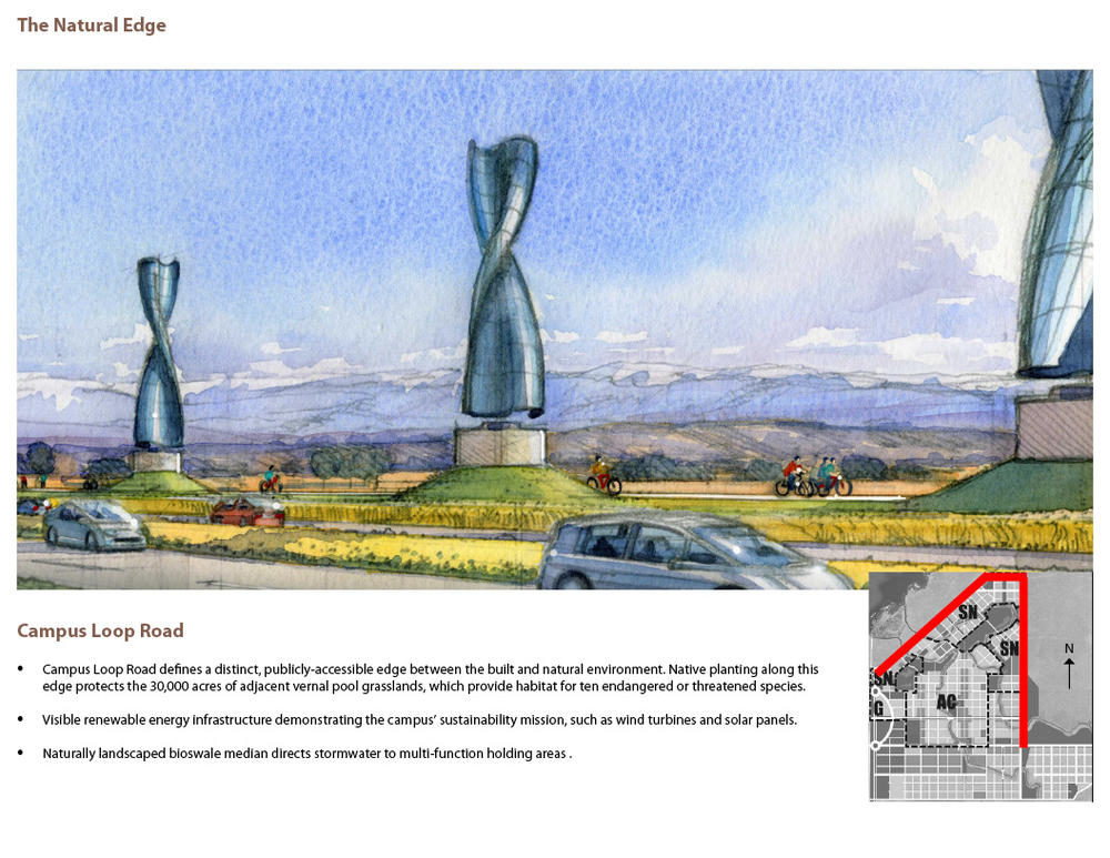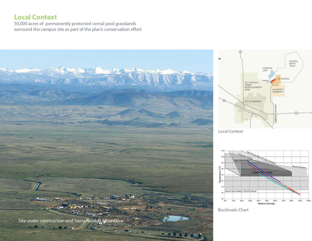 Natural solar income and other renewable sources will meet all of UC Merced’s energy needs. The north/south orientation of the plan’s orthogonal grid is designed to maximize solar collection.