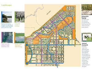 Transportation alternatives include an integrated bicycle and pedestrian network along two irrigation canals that bisect the site. Iconic canal bridges serve as pedestrian landmarks.