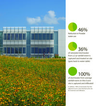 Water metrics - Photo Credit: Assassi + BNIMFrom a site perspective, 100+% of the average annual rainfall event that falls upon the site is infiltrated and treated, along with the diverted adjacent site stormwater. The resulting native prairie landscape is an integral part in the stormwater management system employed on site; it purifies water using native plants for increased downstream water quality and eliminates the need for irrigation.