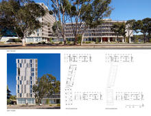 Three apartment buildings are arranged in a C-shape around a courtyard that creates a new social zone and unites it with the existing 1960s Fleet Residences to the east. They adopt elements from the classic campus buildings; exterior walkways, repetitive sun control elements, and a warm color palette, but are firmly rooted in a 21st century aesthetic that unites form and performance. Great lengths were taken to construct the buildings with high quality, cast-in-place white concrete to visually tie them to the existing architecture.